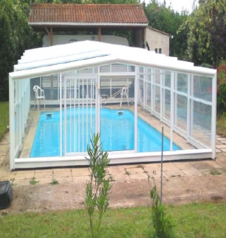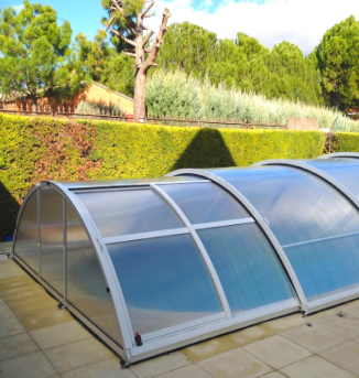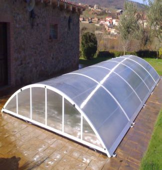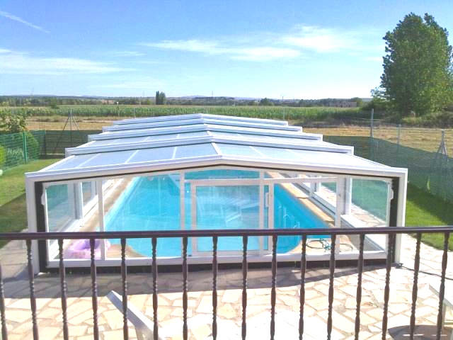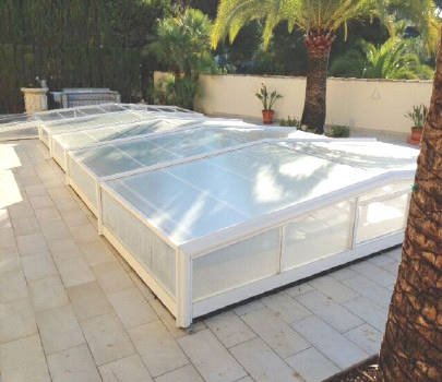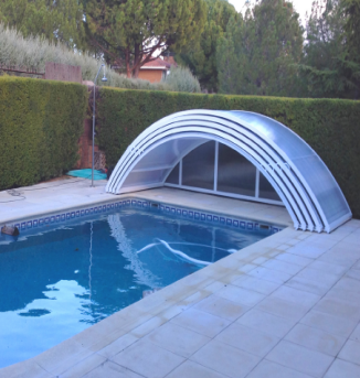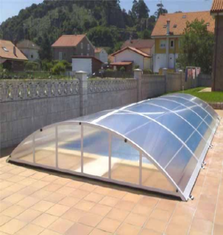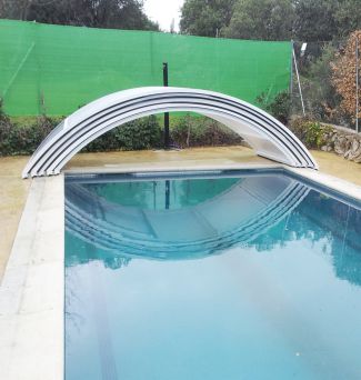 que ofrece al usuario la posibilidad de abrir o cerrar su cubierta en pocos minutos gracias a su sistema de plegado telescópico. Su altura inicial aproximada es de unos 90cm en su primer modulo, es una cubierta que no consta de raíles o guías en suelo dejando todo el perímetro de la piscina sin ningún obstáculo o escalón fabricada a medida.